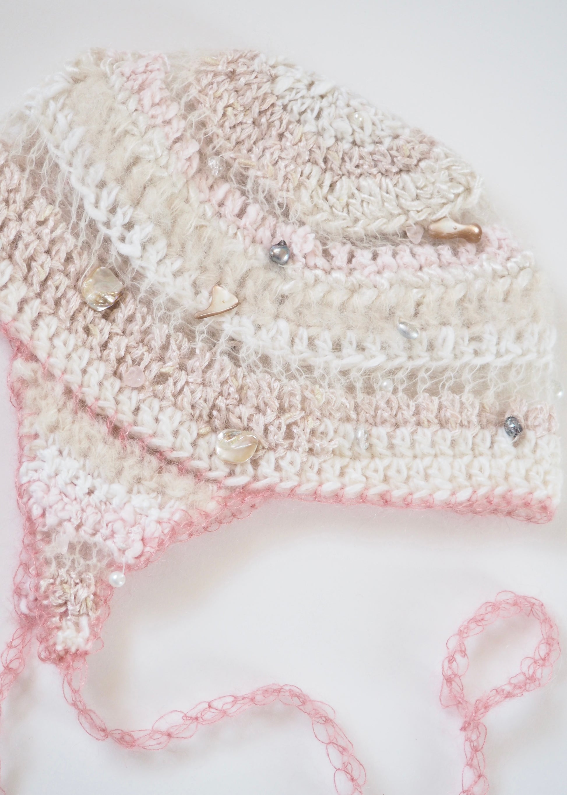 This fluffy and soft crochet cap dream is made from various different -mostly recycled- yarns. Some parts are cotton, some brushed out alpaca mohair, some shiny textured yarn. Adorned with upcycled beads and japanese freshwater pearls, the texture of ADEL is absolutely one of a kind! All the up close details make the cap such an interesting piece.