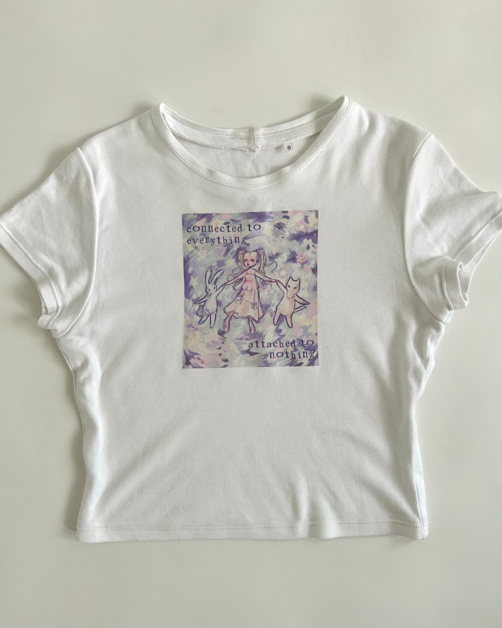 Relaxed, flattering baby tee printed with the cutest artwork made in collaboration with British artist Josh Tomos. Printed in Helsinki by a small supplier. Sewn in our own studio from a comfortable fabric blend of 70% bamboo viscose and 30% organic cotton. Antibacteric and breathable, amazing material for people with sensitive skin!