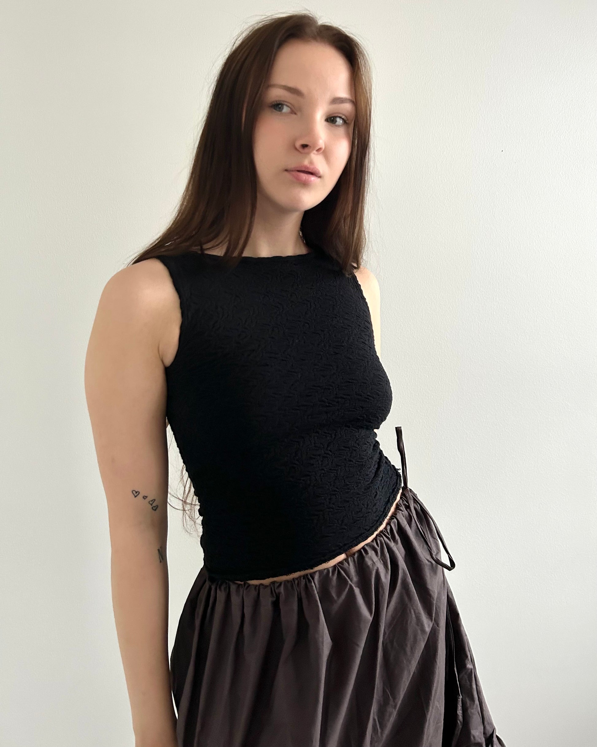 The knit texture offers a lot of coverage making this a very comfortable top to wear braless. Despite having coverage, the top is still very lightweight. The fabric offers quite a bit of stretch, so there’s room to size up or down. For the best fit and length, we recommend comparing the measurements to your favourite tops.